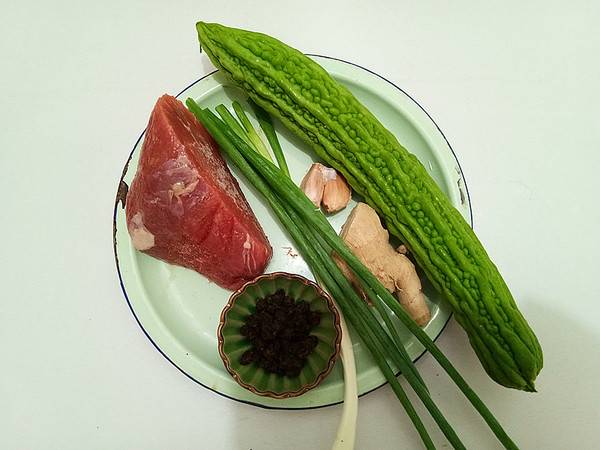 用料:苦瓜1根、牛肉100克、蚝油适量、豆豉1汤匙、葱姜蒜适量、胡椒粉少许、食盐少许、料酒1茶匙、淀粉适量。