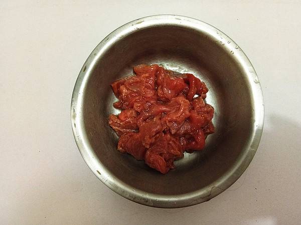 2、牛肉切片,用淀粉,少许食盐、胡椒粉、加一点糖和料酒抓匀腌制10分钟。