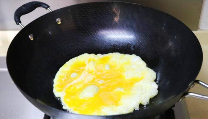 5.油热后倒入蛋液。