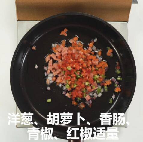 主料:鸡蛋适量、洋葱适量、胡萝卜适量、香肠适量、青椒适量、红椒适量、米饭500克。辅料:食用油10毫升、料酒3毫升、盐3克。