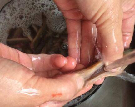 2、剪掉头部,腹部从尾部到头部从中间剪开,然后用清水洗净内脏。