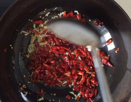6、花椒麻椒炒出香味后,加入切好的葱姜蒜干辣椒,炒出香味,加入生抽、白糖。