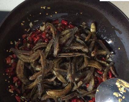 7、辅料炒出香味后,加入煸好的泥鳅,反复翻炒至均匀后,加盐和鸡精即可。