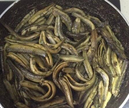 3、平底锅入油,倒入清洗好的泥鳅,小火慢煸,待泥鳅水分煸干,身体变金黄即可捞出。