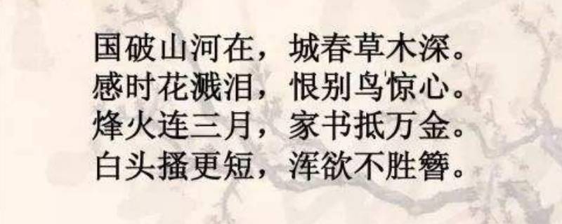 国破山河在的下一句是城春草木深。出自唐代杜甫的《春望》:国破山河在,城春草木深。感时花溅泪,恨别鸟惊心。烽火连三月,家书抵万金。白头搔更短,浑欲不胜簪。