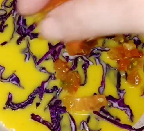 4、蛋液没有定性时,撒入紫甘蓝丝。