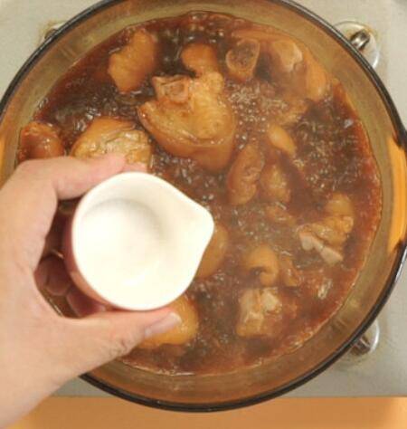 3、食用油5ML,八角1个,桂皮1块,冰糖20克,小火翻炒糖色,倒入猪蹄,小火煎至猪蹄上色。