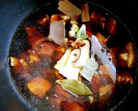 5、加入姜片、葱段、桂皮、香叶、八角、花椒、白酒、陈皮。