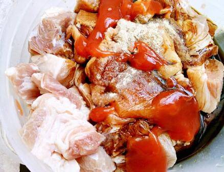 3、控水后放胡椒粉、盐、番茄酱、黄豆酱油、老抽抓匀。