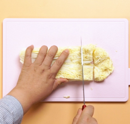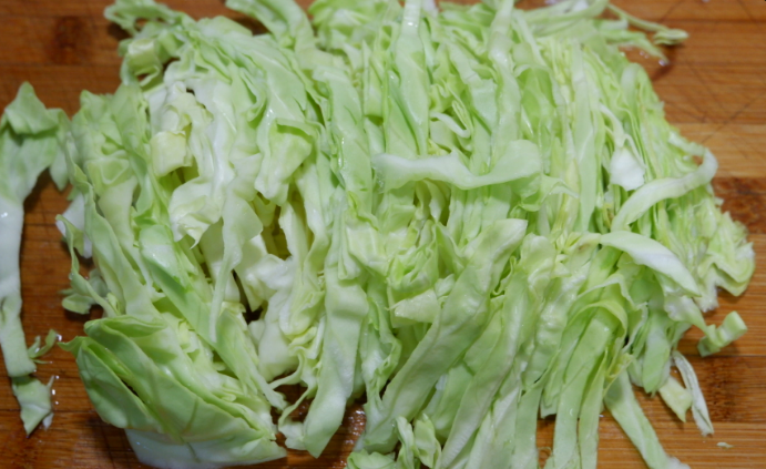 3、白菜洗净,对半切开。切成细丝。
