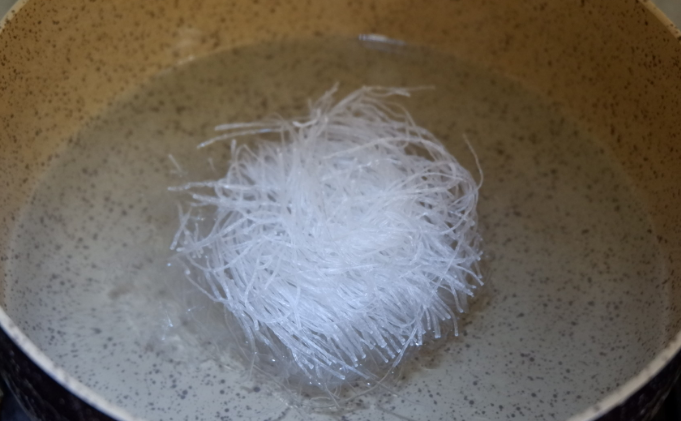2、锅中烧开水,将粉丝放入烫软。烫好之后,取出过凉水。沥干水备用。