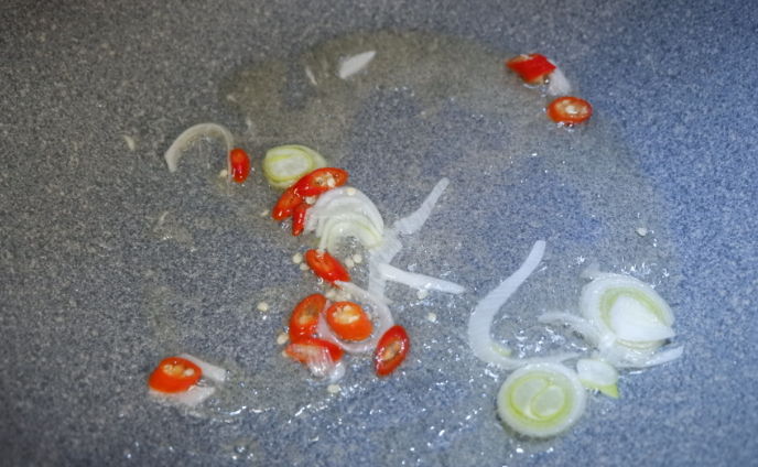 4、锅内热油,将小米椒和葱花加入,炒出香味。