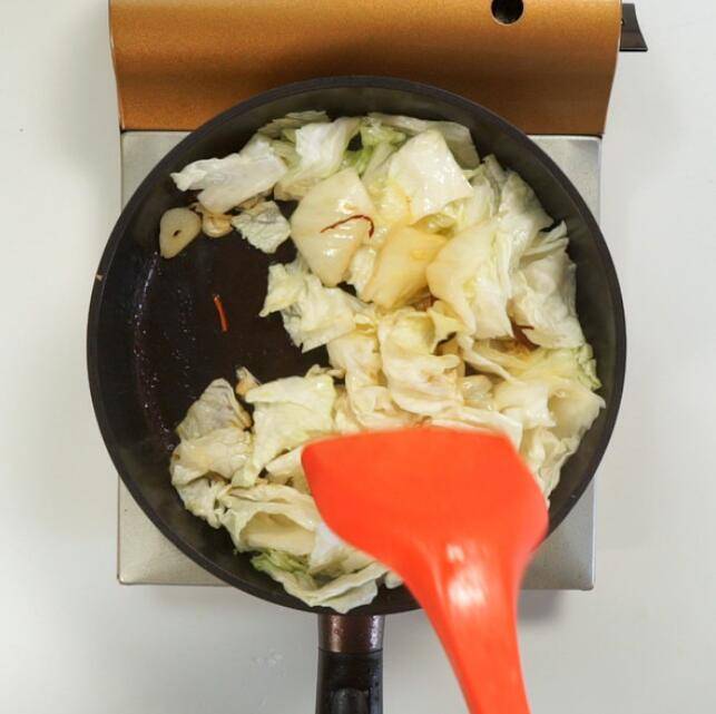5、加入白菜,翻炒片刻。