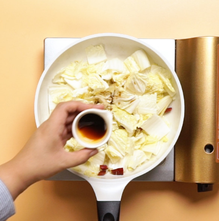 4、倒入白菜,翻炒均匀,倒入醋、生抽,翻炒均匀。