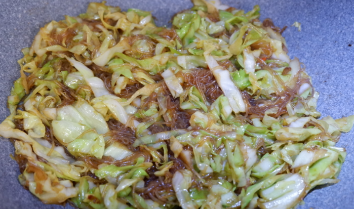 7、将粉丝与白菜炒至完全融合,根据个人口味加少许盐调味即可。