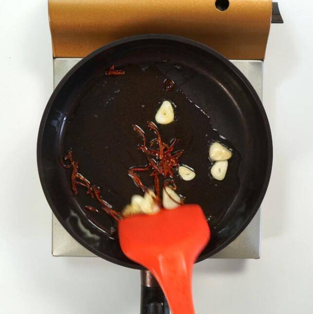 2、锅中放油,倒入花椒、蒜片、干辣椒丝,大火爆香。