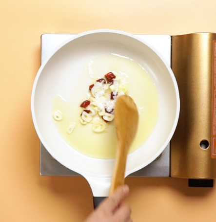 3、倒入食用油、干辣椒、葱花、蒜片、白砂糖,大火爆香。