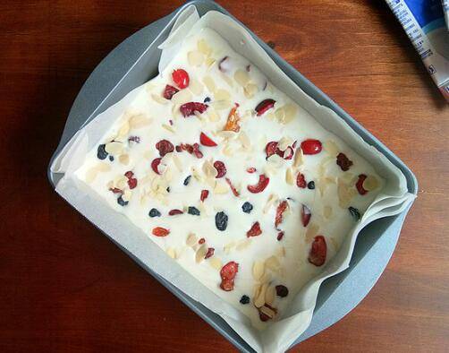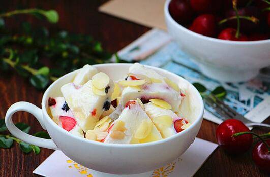 加入樱桃、葡萄干、蔓越莓干、杏仁。放入冰箱中冷冻至酸奶冻硬就可以。