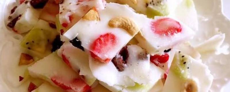 最佳答案主料:酸奶500克。辅料:葡萄干适量、蜂蜜适量、蔓越莓干适量、樱桃适量、杏仁适量。葡萄干洗净,樱桃去核切小块备用。准备一个托盘,铺入烘焙用油纸。倒入酸奶,大约1cm的厚度就可以啦,不需要太厚。加入蜂蜜拌匀。加入樱桃、葡萄干、蔓越莓干、杏仁。放入冰箱中冷冻至酸奶冻硬就可以。冻好后即可...