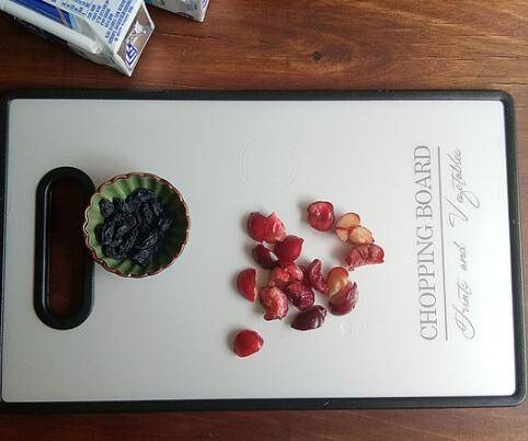 葡萄干洗净,樱桃去核切小块备用。