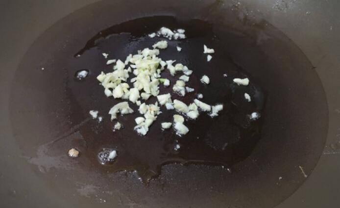 3.锅内倒油烧热,油温升高后,将切好的蒜倒入爆香。