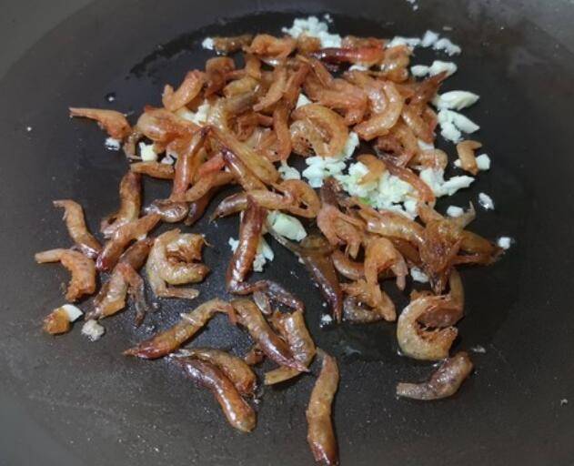 4.蒜香味出来后,倒入小油虾翻炒片刻。