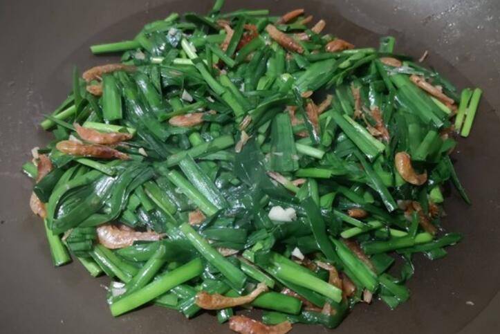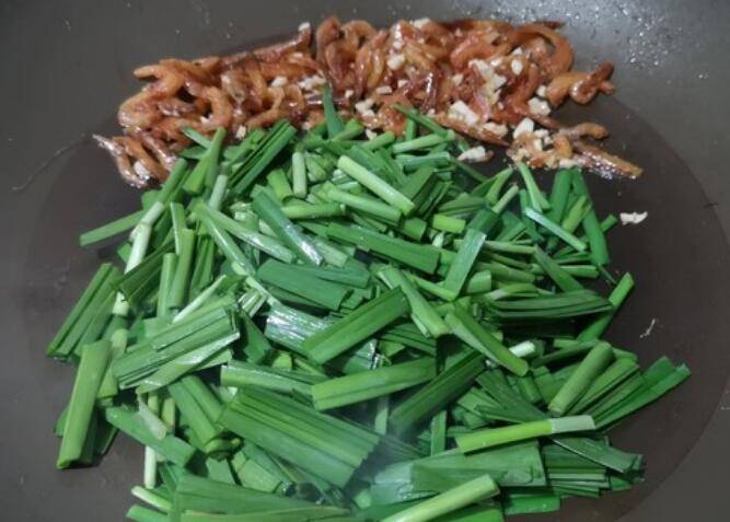 6.韭菜炒软后,和小油虾一起翻炒均匀。