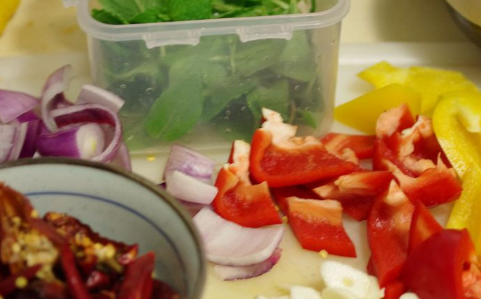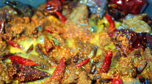 出锅放入辣椒粉,花椒粉,彩椒块、薄荷叶即可。