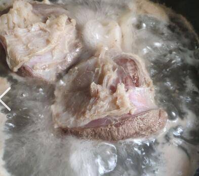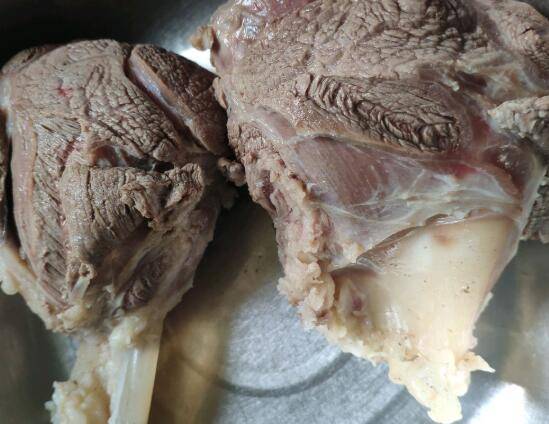 取一大条牛腱子,从中间切开。先把牛腱子放在冷水浸泡两个小时,捞出入冷水锅放入三片姜大火烧开,煮五分钟左右。煮好以后把牛腱子肉放入温水中洗净外面的附着物。