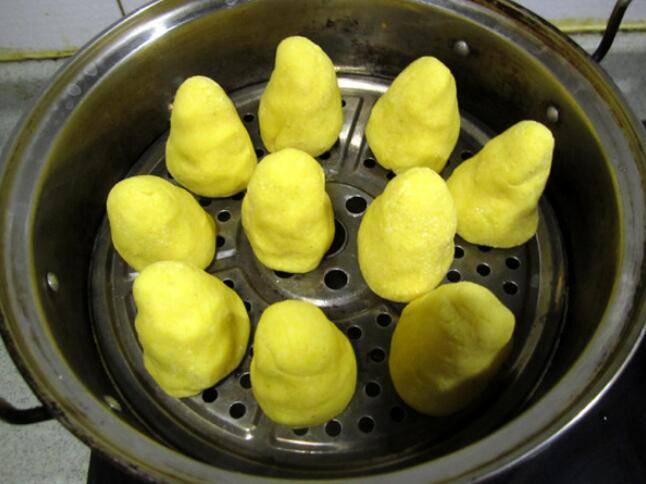 6、蒸笼面上抹油后将做好的窝窝头放上面,锅中放水,开大火蒸,蒸八分钟左右后开锅即可食用。