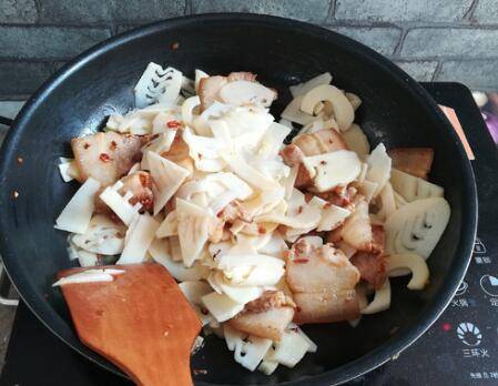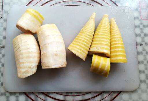 用料:五花肉250克、春笋3根、蒜米4瓣、辣椒1个、盐2克、生抽5克、蚝油10克、食用油20克、葱花适量。