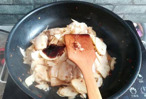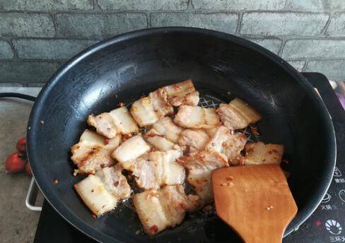 11、再加入15克油,五花肉翻炒到肉片边缘有轻微焦黄。