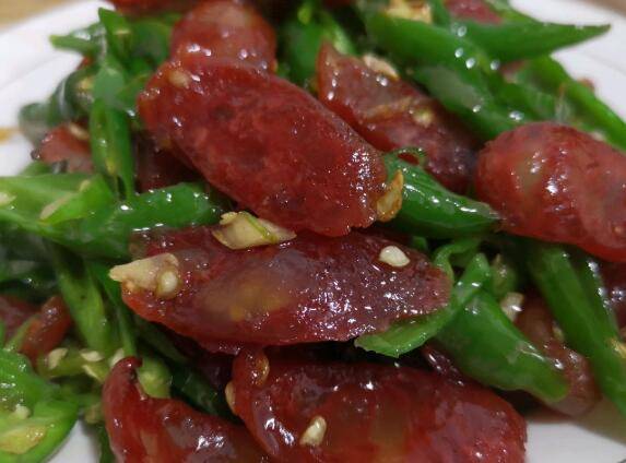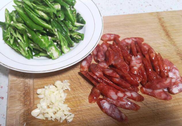 香肠四根、青辣椒12个、蒜子3个、生抽2勺、盐适量、味精适量。