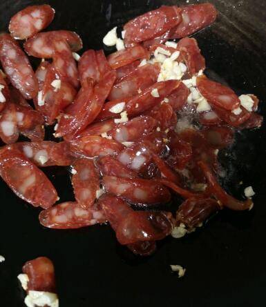 2、锅热倒油,爆香蒜子。再倒入香肠,小火翻炒到透明。