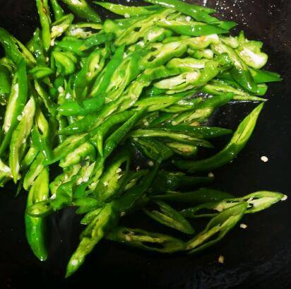4、油加热,倒入辣椒,放半勺盐,把辣椒炒软。