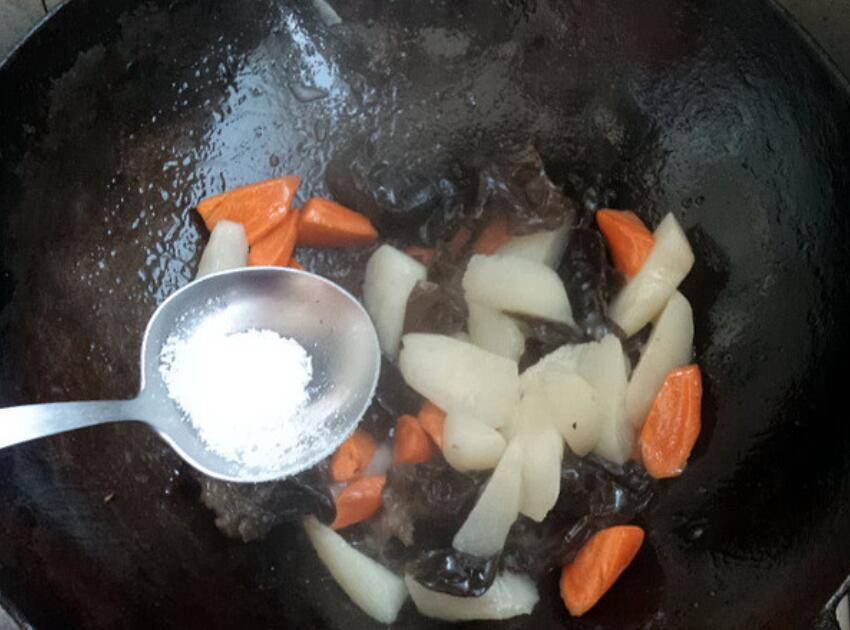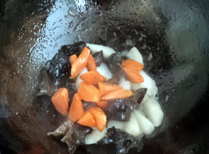 6、木耳入锅炒。
