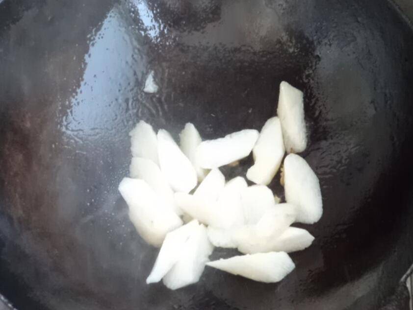5、再起油锅,葱姜入锅煸香后,山药入锅炒。