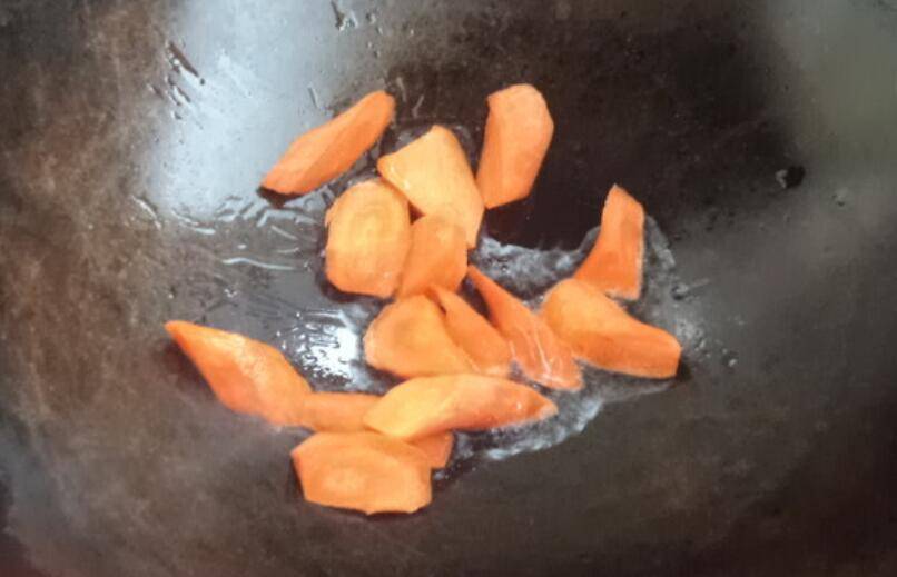 7、胡萝卜入锅炒。