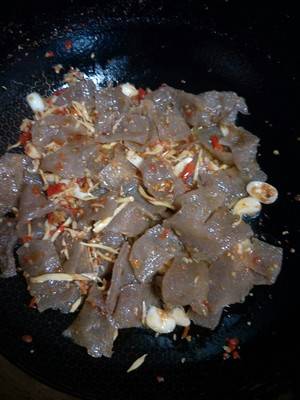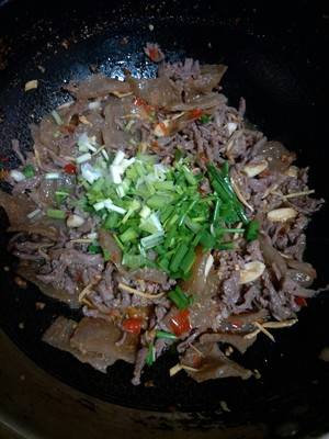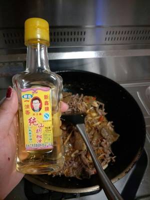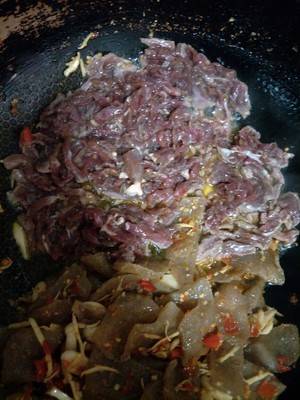 7、牛肉和魔芋炒匀,加入山胡椒油。