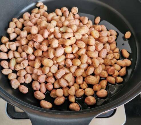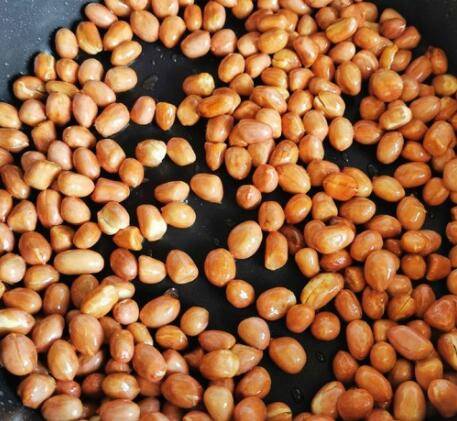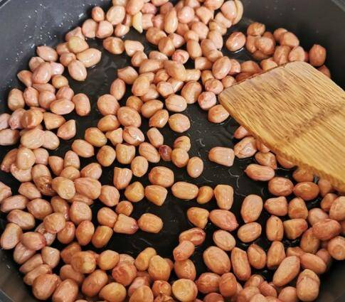 3、倒入花生米,中小火慢炒。