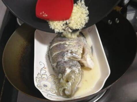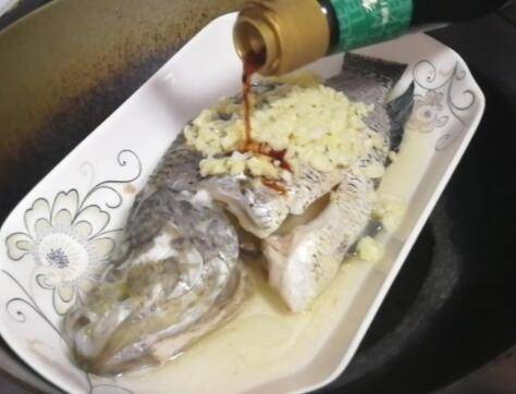 鱼蒸熟了,开盖把大蒜油一起淋到鱼上。