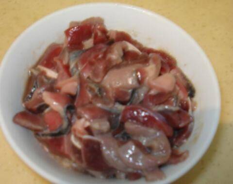 尖椒洗净去籽切块;鸡胗洗净,切片,用料酒和盐、生粉腌制15分钟。
