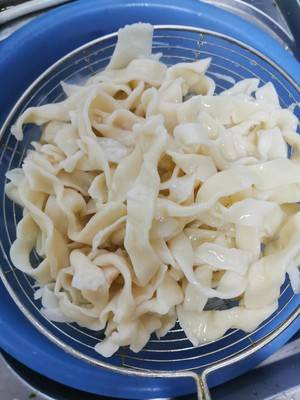 1、手擀面擀好备用,锅中放冷水煮开,放入手擀面煮熟,捞出放冷水备用。