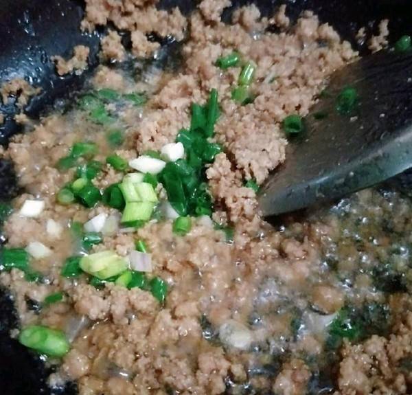 2、锅中倒油,放入肉沫炒散,再放入蒜末,圆葱末,胡萝卜末,炒香,盛出备用。