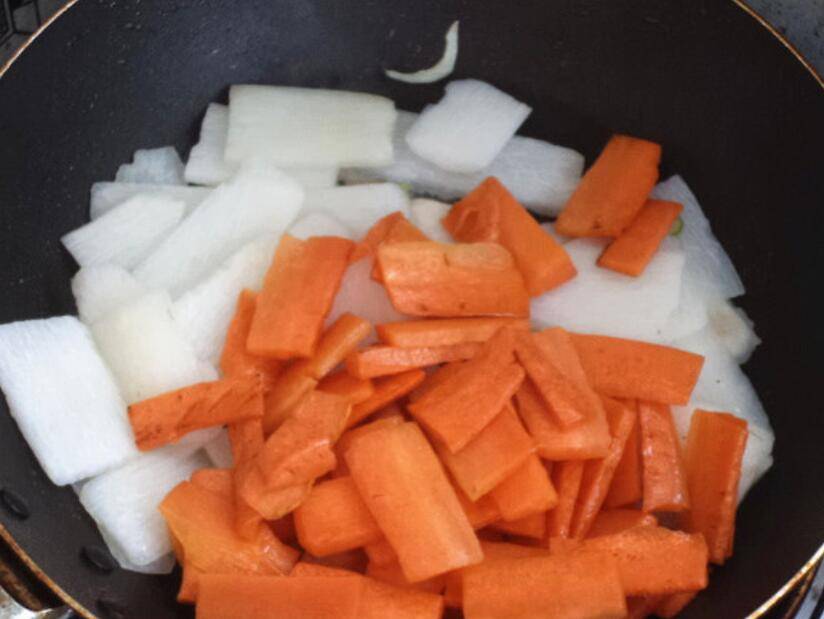 4、再起油锅,葱姜入锅煸香后,山药入锅炒。