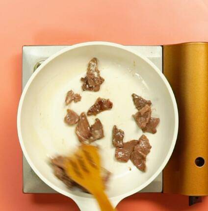 锅中放油,牛肉炒至变色。