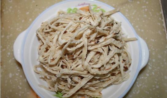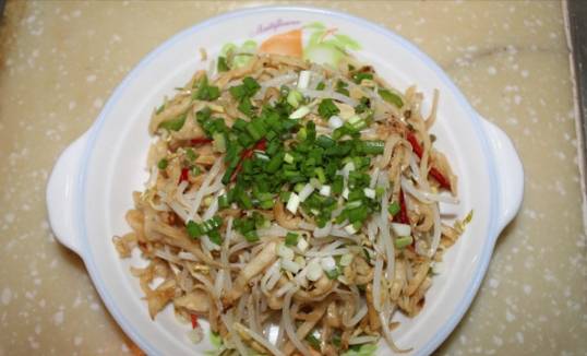 4、下入饼丝,翻炒2分钟后起锅装盘,撒上香葱碎即可食用。
