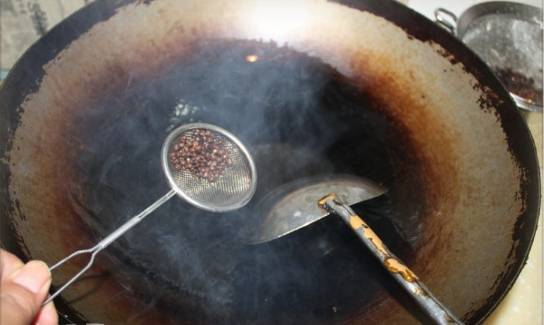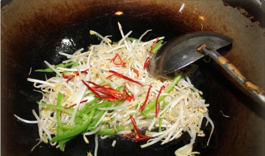 2、锅中倒油,油烧热,炸香花椒后捞出,下入豆芽菜、青椒煸炒。
