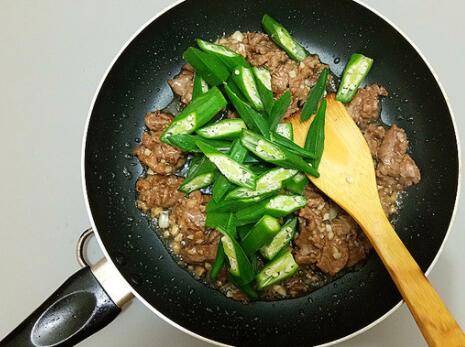用料:牛肉150克、秋葵150克、黑胡椒酱2茶匙、蚝油适量、料酒1茶匙、食盐少许、大蒜4瓣。