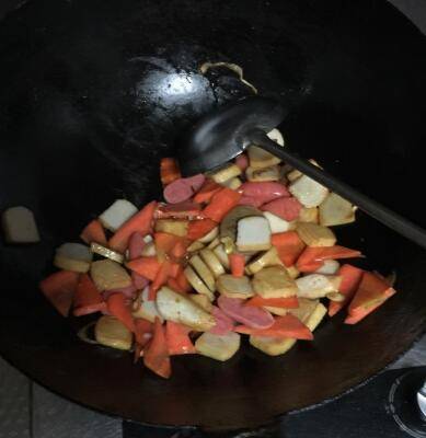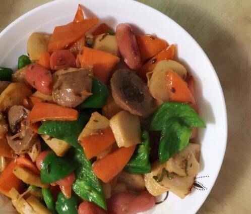 丸子适量、大葱1段、胡萝卜1颗、青椒2只、淀粉1勺、盐少许。
